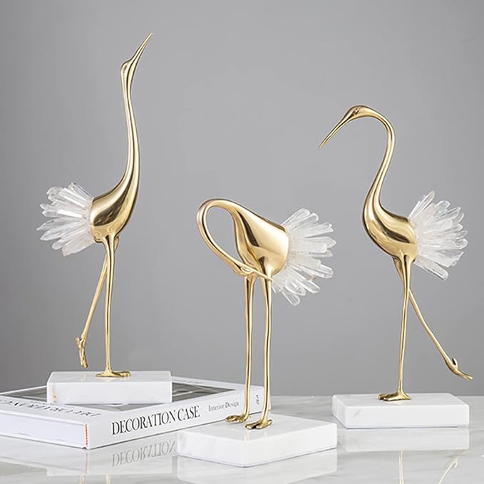 The Crane Statue is expertly crafted from brass, with its tails delicately hand-pasted using high-quality crystals. The statue features a solid marble base, providing a substantial and elegant feel. The bird’s body boasts a striking metallic luster, while the smooth and delicate finish highlights its exquisite craftsmanship.